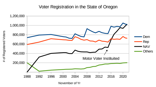 In Oregon there are actually several ways to generate Phantom Voters legally, the most obvious one being the Motor Voter law. Under Oregon law, every US citizen who visits their Department of Motor Vehicles to obtain or renew a drivers license or ID card automatically is registered to vote. This law was implemented in January of 2016 and has inflated the voter rolls by registering a large number of people who are minimally interested in voting, or else they probably would have already registered, probably under a political party. When at the DMV the licensee has the chance to specify a political party, but if no preference is stated on the form, the individual is registered as a non-affiliated voter (NAV). And, of course, in addition to flooding the voter registration rolls with minimally interested voters, these are a large block of voters available for use as Phantom Voters. This graph shows how the number of NAV registrants have increased since the law was put into effect so that currently (April, 2022) it is the largest block of voters in Oregon.